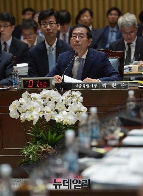 국회 안전행정위원회의 서울특별시 국정감사가 17일 서울시청에서 열린 가운데, 박원순 서울시장이 질의를 듣고 있다.