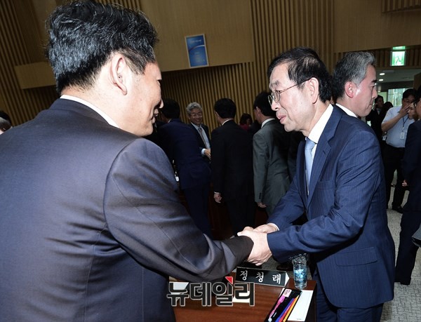 [포토] 서울시 국감, 악수하는 박원순-정청래