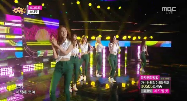 소나무는 19일 오후 방송된 MBC '쇼 음악중심'에 출연해 '빙그르르'를 불렀다.