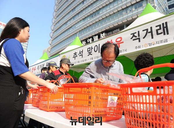 한우자조금관리위원회는 22일 오전 서울 청계광장에서 [추석맞이 한우 직거래장터]를 개최했다. 이날 홍보 모델들이 산지에서 생산된 한우를 홍보하고 있다.이번 행사 상품은 1등급 100g 기준으로 안심 8,000원, 등심 7,200원, 채끝 6,900원, 양지 4,500원, 국거리와 불고기용 정육이 각각 3,000원에 판매된다. 오는 23일까지 오전 9시부터 오후 7시까지 진행되며 '의성 마늘소'와 '정읍한우' 브랜드가 참여해 산지에서 매일 신선한 한우를 직접 공급한다.이외에도 직거래장터를 방문한 소비자들을 위해 한우부위별 다트이벤트와 한우불고기시식회 등 다양한 이벤트를 진행하고 있다.