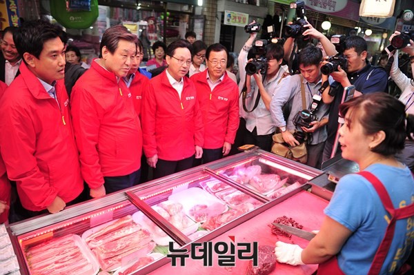 새누리당 김무성 대표가 추석 연휴를 앞둔 23일 오후 서울 관악구 신사시장을 방문해 상인과 대화를 나누고 제수용품을 구입하고 있다.