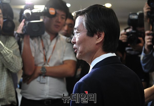 새정치민주연합 혁신위원회가 해당행위자로 지목한 조경태 의원이 24일 오전 서울 여의도 국회 정론관에서 기자회견을 마치고 기자들의 질문에 답하고 있다.