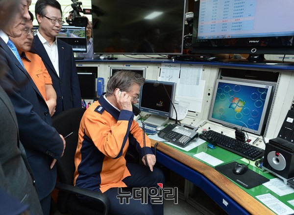 추석 민심잡기에 돌입한 새정치민주연합 문재인 대표가 25일 오전 서울 용산구 한강로에 위치한 용산소방서를 방문해 소방대원들을 격려하고, 상황실을 둘러봤다.
