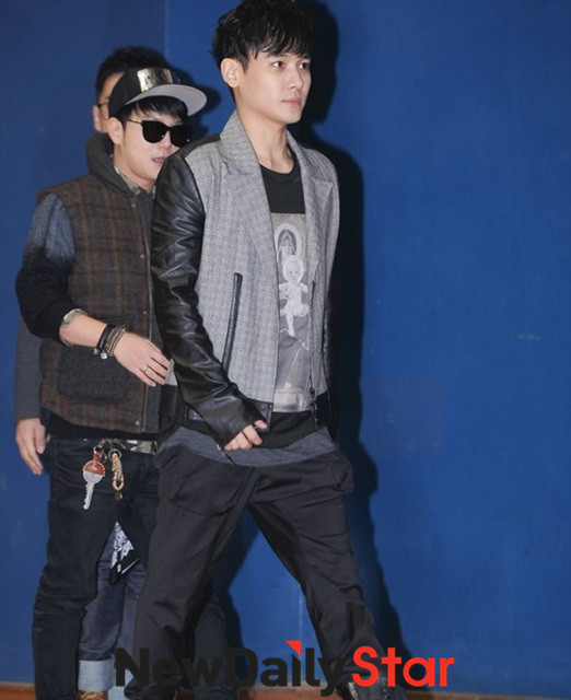 이날 클릭비는 블랙과 그레이가 믹스매치된 재킷과 블랙팬츠를 입고 입장하고 있다,