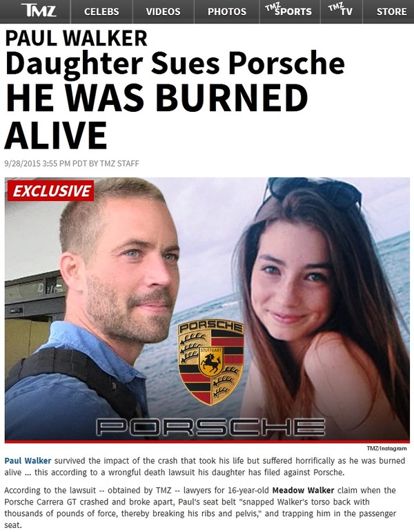 연예매체 TMZ닷컴은 현지시각으로 28일자 보도에서 "故 폴 워커의 딸, 미도우 워커(Meadow Walker)가 고인이 사망 직전 타고 있던 자동차 제조사 포르쉐의 법적 책임을 묻는 소송을 제기했다"며 "고인의 직접적인 사망 원인은 사고 충격이 아닌, '화재'였다는 새로운 사실을 공개했다"고 밝혔다.