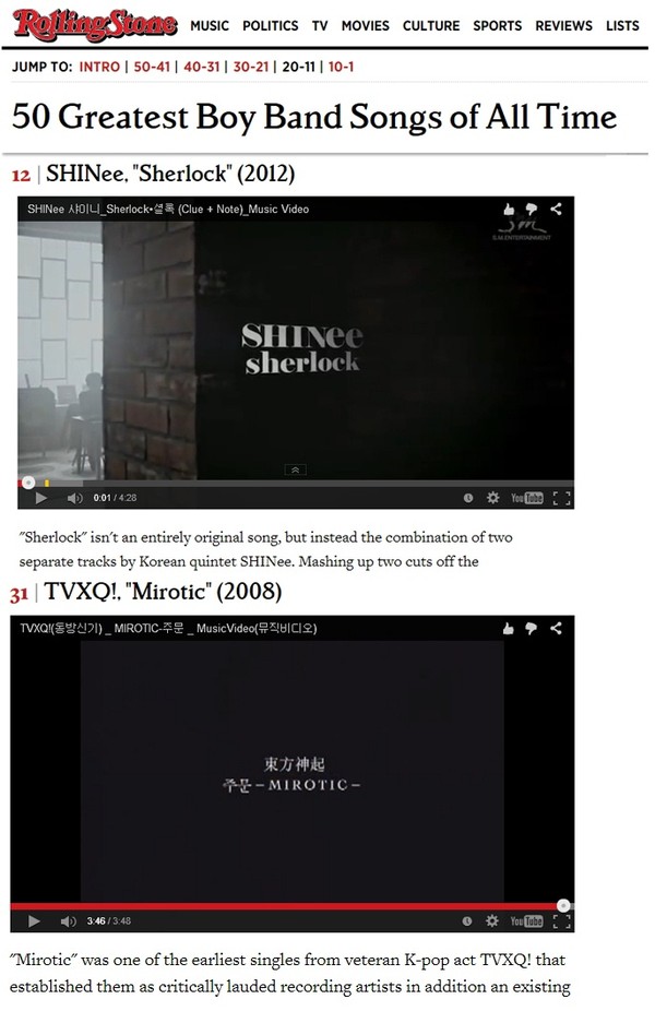 샤이니와 동방신기(에스엠 엔터테인먼트 소속)가 미국 롤링스톤지가 발표한 ‘역대 최고의 보이밴드 송 50(50 Greatest Boy Band Songs of All Time)’에 선정돼 화제다.