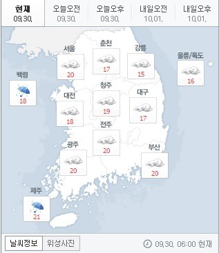기상청은 30일 오전 "현재 전국에 구름이 많고, 제주도는 흐린 날씨를 보이고 있다"고 밝혔다.