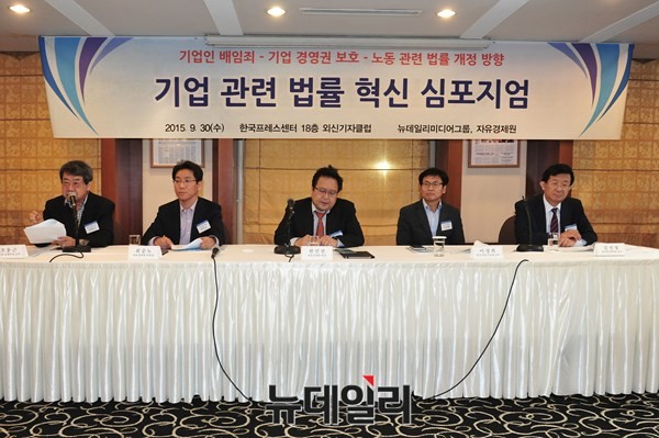 국내 경제, 사회 등 학계 전문가들과 정관계 인사들이 참여한 가운데 기업인 배임죄, 기업 경영권 보호, 노동 관련 법률 개정 방향을 주제로 '기업 관련 법률 혁신 심포지엄'이 30일 오후 서울 중구 한국프레스센터에서 뉴데일리경제 주최로 열렸다.