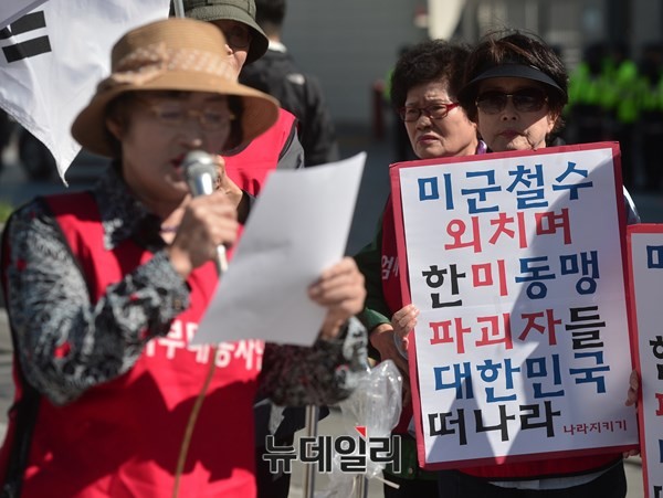엄마부대봉사단이 2일 오전 서울 종로구 세종대로 주한미국대사관 앞에서 기자회견을 열고, [한미동맹 파괴하는 불순세력의 미국 입국을 불허하라]고 주장했다.