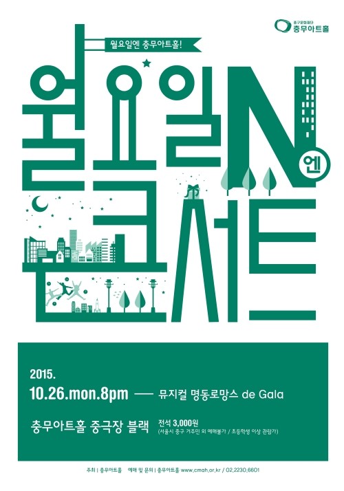 공연장 휴관일인 월요일을 활용한 충무아트홀의 공연브랜드 '월요일N콘서트'가 오는 10월 26일 뮤지컬 '명동로망스'의 갈라 콘서트로 돌아온다.뮤지컬 '명동로망스'는 2015년을 살고 있는 9급 공무원 장선호가 1956년 명동의 로망스 다방으로 건너가서 펼쳐지는 이야기를 담은 타임슬립 소재의 작품.2013년 충무아트홀의 창작콘텐츠 지원사업인 뮤지컬하우스 '블랙앤블루'(이하 BNB)에 선정된 바 있다. 이후 BNB쇼케이스 및 제3회 서울뮤지컬페스티벌 예그린앙코르를 거치며 약 2년간의 작품개발기간을 거쳐 완성된 창작뮤지컬이다.특히, 1950년대 명동을 배경으로 활약했던 실존인물인 화가 이중섭(1916-1956), 시인 박인환(1926-1956), 작가 전혜린(1934-1965) 등을 타임슬립한 주인공이 직접 만나 인생과 예술을 논하고 우정을 쌓아가는 과정을 친근하면서도 독특하게 그려냈다.충무아트홀이 위치한 중구 지역민만을 위해 매짝수월 열리는 '월요일N콘서트'는 지난해 10월 첫 공연을 시작으로 피아노 연주, 뮤지컬 갈라콘서트, 매직쇼 등 지금까지 총 6회에 걸쳐 성황리에 개최해왔다.'월요일N콘서트'는 10월 6일 오후 2시 충무아트홀 홈페이지 및 인터파크에서 티켓을 오픈하며, 서울시 중구민(1인 2매 한정)에 한하여 예매할 수 있다.