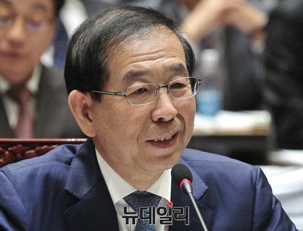 박원순 서울시장이 6일 오전 서울 중구 세종대로 서울시청에서 열린 국토교통위원회 서울시 국정감사에서 여당의원 질문에 웃음을 보이고 있다.