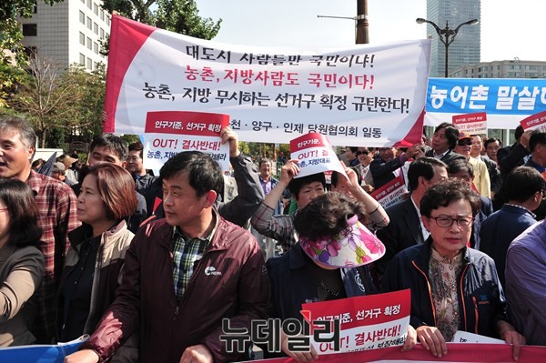 농어촌 지방주권 지키기 의원모임 소속 의원들과 지역구민 3000여 명이 6일 서울 여의도 국민은행 앞에서 농어촌 지방을 위한 선거구 획정방안 합의와 선거구 축소 반대를 주장하며 시위를 벌이고 있다.<참석 국회의원>새누리당 강석호(경북 영양·영덕·봉화·울진) 경대수(충북 증평·진천·괴산·음성) 김광림(경북 안동) 김재원(경북 군위·의성·청송) 김종태(경북 상주) 김태흠(충남 보령·서천) 박덕흠(충북 보은·옥천·영동) 안상수(인천 서강화을) 염동열(강원 태백·영월·평창·정선) 이완영(경북 고령·성주·칠곡) 이이재(강원 동해·삼척) 이철우(경북 김천) 이한성(경북 문경·예천) 장윤석(경북 영주) 한기호(강원 철원·화천·양구·인제) 홍문표(충남 홍성·예산) 황영철(강원 홍천·횡성) 의원이 참석했다.새정치민주연합에서는 강동원(전북 남원·순창) 김성곤(전남 여수갑) 김승남(전남 고흥·보성) 김영록(전남 해남·완도·진도) 김춘진(전북 고창·부안) 박민수(전북 무주·진안·장수·임실) 신정훈(전남 나주·화순) 유성엽(전북 정읍) 이개호(전남 담양·함평·영광·장성) 이윤석(전남 무안·신안) 주승용(전남 여수을) 황주홍(전남 장흥·강진·영암) 의원이 자리했다.