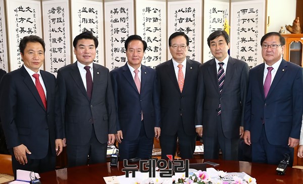 정의화 국회의장이 12일 오전 서울 여의도 국회에서 새누리당 원유철 원내대표와 새정치민주연합 이종걸 원내대표를 만나 내년 농어촌 지역구, 권역별 비례대표제 등 선거구획정안에 대한 이견을 조율하기에 앞서 기념사진을 촬영하고 있다.