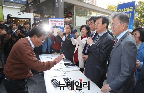 문재인 새정치민주연합 대표 및 지도부가 13일 오후 서울 여의도역 앞에서 [역사교과서 국정화에 반대하는 서명]을 받는중 어버이연합 추선희 사무총장이 항의를 하고 있다.