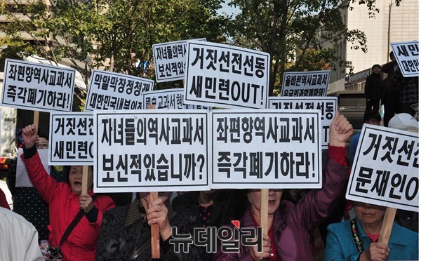 애국보수 어버이연합이 13일 오후 서울 여의도역 앞에서 [역사교과서 국정화에 반대하는 서명]을 받고 있는 문재인 새정치민주연합 대표 및 지도부를 향해 항의 시위를 하고 있다.