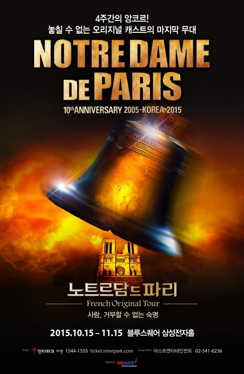 한국인이 가장 사랑하는 프랑스 뮤지컬 '노트르담 드 파리' 오리지널팀의 서울 공연이 드디어 시작된다.지난 10일 용인 포은아트홀에서 몸을 푼 프렌치 오리지널 팀은 10월 15일부터 11월 15일까지 블루스퀘어 삼성전자홀에서 공연하며, 12월 중순까지 대규모 전국투어를 펼친다.특히, 이번 공연에서는 1998년부터 17년 동안 콰지모도 역을 1,000회 이상 소화해 낸 맷 로랑을 비롯해 그랭구와르 역을 맡아 큰 인기를 모은 리샤르 샤레스트, 2006년부터 2009년까지 뮤지컬 '로미오 앤 줄리엣' 내한공연에서 머큐쇼 역을 맡은 존 아이젠이 그랭구와르 역을, 오리지널 클로팽의 루크 메빌이 처음 내한한다.한국에 첫 선을 보이는 세 명의 배우들도 있다. 앞서 언급한 루크 메빌은 1998년 초연부터 2001년까지 클로팽 역으로 출연했으며, 런던, 몬트리올, 미국, 러시아, 스위스, 벨기에 등 800회 이상 이 역할을 소화했다.