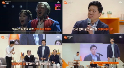 뮤지컬 배우 정성화가 재치있는 입담을 과시했다.정성화는 지난 18일 방송된 JTBC '김제동의 톡투유-걱정말아요'에 게스트로 출연해 '말'을 주제로 한 다양한 에피소드를 풀어냈다.이날 정성화는 고부 갈등을 논하는 청중의 고민에는 실제 자신의 경험을 빗대어 이야기하며 청중들의 격한 공감을 이끌어냈다. 또, 청중들을 위해 뮤지컬 '레미제라블'의 아름다운 넘버를 불러 이목을 집중시켰다.특히, 그가 장발장의 대표 넘버 '브링 힘 홈(Bring Him Home)'을 열창하자 프로그램 녹화장인지 뮤지컬 무대인지 분간이 안 갈정도로 노래에 몰입하는 모습을 보여줬다. 이어 '피플 송(People’s Song)' 부를 때는 모든 관객들이 박수 갈채를 보냈다.한편, 빅토르 위고의 동명 소설을 원작으로 한 뮤지컬 '레미제라블'은 기구한 운명의 청년 장발장의 인간애와 박애정신을 그린다. 정성화는 주인공 장발장 역을 맡아 현재 연습에 한창이다.뮤지컬 '레미제라블'은 오는 10월 21일 대구 계명아트센터에서 개막을 앞두고 있으며, 이후 11월 28일부터 서울 블루스퀘어 삼성전자홀에서 공연을 이어갈 예정이다.