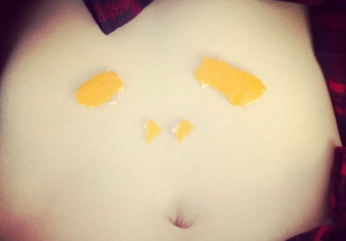 공개된 사진 속 태연은 자신의 배 위에 귤껍질을 올려 사람 얼굴을 만들어 놓았다. 특히 태연의 뽀얀 살결의 눈길을 끌고 있다.