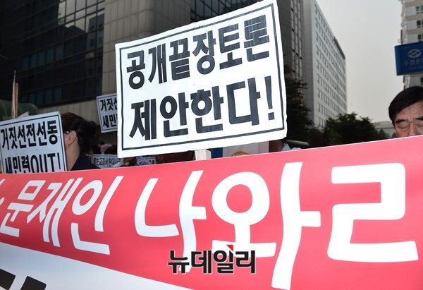 대한민국어버이연합을 비롯한 애국단체가 19일 오후 서울 여의도 새정치민주연합 당사 앞에서 기자회견을 열고, 새정치민주연합 문재인 대표에게 한국사 교과서 국정화에 대한 연합대 연합 공개 끝장토론을 제안했다.