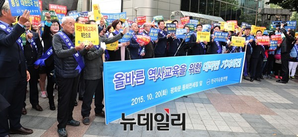 한국자유총연맹 회원들이 20일 오후 서울 종로구 동화면세점 앞에서 [올바른 역사교육을 위한 대국민 기자회견]을 갖고 있다.