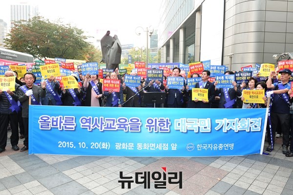 한국자유총연맹 회원들이 20일 오후 서울 종로구 동화면세점 앞에서 [올바른 역사교육을 위한 대국민 기자회견]을 갖고 있다.