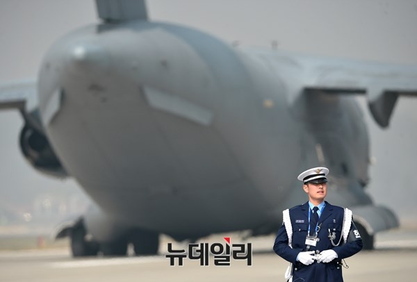 [서울 국제 항공우주 및 방위산업전시회(ADEX)] 개막식이 20일 경기 성남 서울공항에서 개막했다.이날 개막식 기념비행에는 우리공군 블랙이글의 곡예비행, 미 공군 전략수송기 C-17 기념비행이 예정돼 있었지만 짙은 미세먼지 농도로 취소됐다. 미 공군의 F-22 랩터 스텔스 전투기의 시험비행은 약 1시간 지연돼 진행됐다.20일부터 25일까지 서울공항에서 열리는 이번 전시회는 국내외 우수한 항공기 및 방위산업 제품 63종 77대가 전시된다. 성능과 국제 경쟁력이 증명되어 수출 중인 KT-1 기본 훈련기와 T-50 고등훈련기의 시범비행과 국내 기술로 개발한 K-2 전차, K-9 자주포, K-21장갑차, 차기다연장로켓포 천무 등이 전시된다.세계 항공우주 및 방위산업의 기술 트렌드를 알아보기 위한 국제항공우주심포지엄, 항공우주무기체계발전세미나, 미래지상군발전국제심포지엄, 국제무인항공시스템심포지엄, 국제항공기술심포지엄 등 다양한 국제행사가 전시회 기간 개최된다.(성남=뉴데일리 정상윤 기자