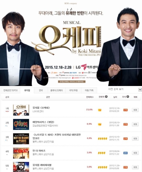 뮤지컬 '오케피'가 1차 티켓 오픈과 동시에 인터파크의 예매율 랭킹 1위를 차지했다.21일 제작사 샘컴퍼니 측은 "뮤지컬 '오케피'는 20일 오후 2시 티켓 오픈과 동시에 쟁쟁한 대작들을 모두 제치고 1위 등극이라는 쾌거를 이뤘다"고 밝혔다.연말 대극장 작품 중 유일하게 초연작인 '오케피'는 재연작들과의 치열한 경쟁 속에도 굴하지 않고 압도적인 캐스팅과 이슈를 끌어내며 많은 관객들의 시선을 집중시키고 있다.일본의 천재작가 미타니 코키의 동명 원작인 뮤지컬 '오케피'는 화려한 무대 위보다 재미있는 무대 아래 오케스트라 단원들의 이야기로 한 번도 한국에서 다뤄진 적 없는 새로운 극이다.황정민 연출, 김문정 음악감독, 서숙진 무대디자이너 등이 의기투합했으며 황정민, 오만석, 서범석, 윤공주, 린아, 박혜나, 최재웅, 김재범 등 초호화 캐스팅을 자랑한다. 오는 12월 18일부터 LG아트센터에서 개막한다.[뮤지컬 '오케피' 포스터, 사진=㈜샘컴퍼니]