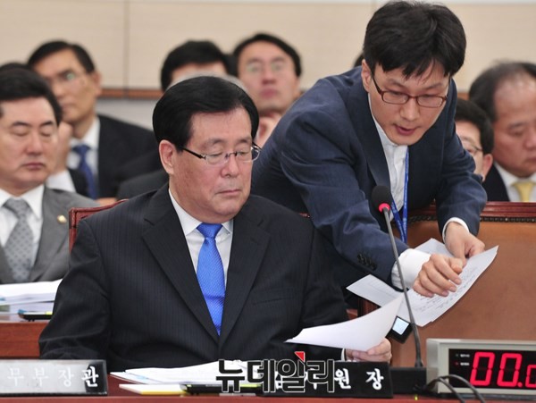 황찬현 감사원장이 22일 오전 서울 여의도 국회에서 열린 법제사법위원회 전체회의에 출석해 보좌진의 설명을 듣고 있다.