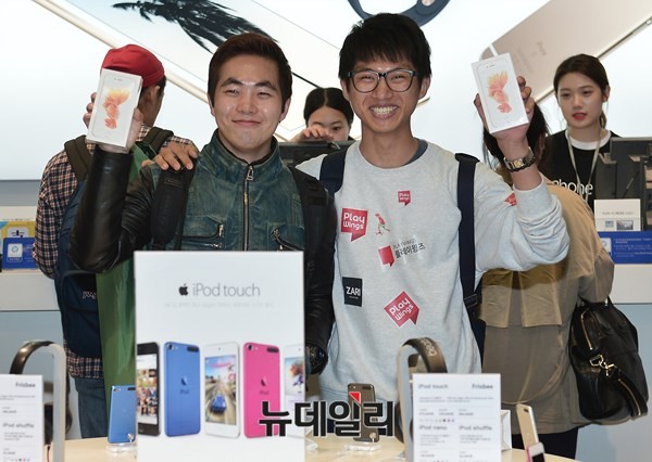 애플 아이폰 6S 시리즈 국내 출시일인 23일 오전 서울 명동 프리스비에는 아이폰 6S 시리즈를 구매하려는 구입자들이 매장 오픈 전 부터 줄을 서서 아이폰6S 시리즈를 구매했다. 판매는 이날 오전 8시부터 진행됐다.