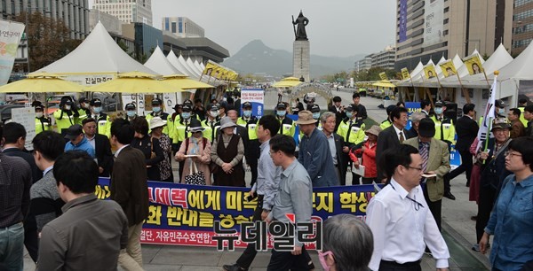 • 종북좌익척결단을 비롯한 애국단체가 23일 정오 광화문 이순신동상 앞에서 한국사교과서 국정화 지지 기자회견을 이어갔다.