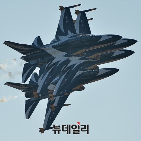 [서울 국제 항공우주 및 방위산업 전시회(ADEX)] 닷새째인 24일 오후 경기 성남 서울공항에서 우리공군 블랙이글 팀이 곡예비행을 하고 있다.