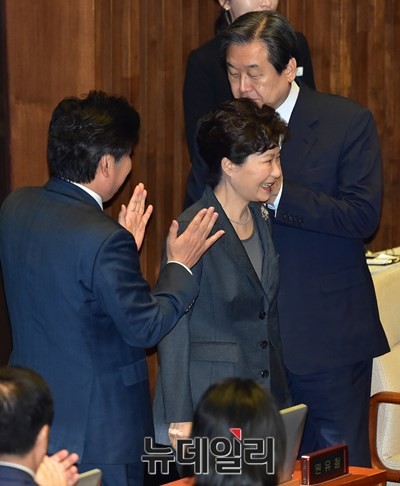 박근혜 대통령이 27일 오전 서울 여의도 국회 본회의장에서 [2016년도 예산안 시정연설]을 하기 위해 입장하고 있다. <사진=사진공동취재단>