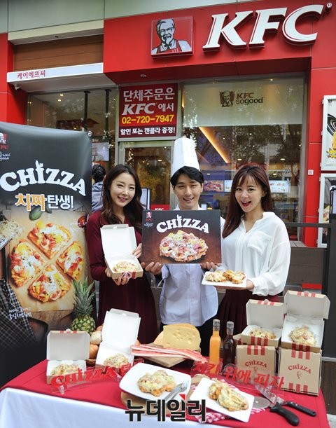 치킨 전문 브랜드 KFC가 2일 오전 서울 종로구 KFC 청계천점에서 신메뉴 '치짜(CHIZZA)' 출시행사를 하고 있다.KFC '치짜'는 빵 도우 대신 100% 국내산 통살 치킨 필렛 위에 베이컨, 모짜렐라 치즈, 파인애플, 양파 등 다양한 피자 토핑을 풍성하게 얹어 오븐에 구워낸 제품이다.또한 KFC는 이번 신제품 출시를 기념해 오는 14일(토)까지 치짜와 콜라(M)로 구성된 치짜콤보를 단품 가격인 4,800원에 즐길 수 있는 할인 이벤트를 진행한다.