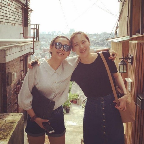 사진 속 안신애와 슈퍼스타K7 천단비는 골목에서 다정하게 어깨동무를 한 채 활짝 웃으며 카메라를 응시하고 있다.