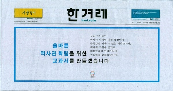 이 중에서 가장 주목을 받고 있는 매체는 <한겨레>다. <한겨레>는 지난달 19일 교육부의 국정교과서 추진에 반대하는 보도를 쏟아낸 것과는 달리, '신문의 얼굴'이라 할 수 있는 1면 하단에 '교육부의 입장'을 대변하는 의견 광고를 게재해 빈축을 산 바 있다.