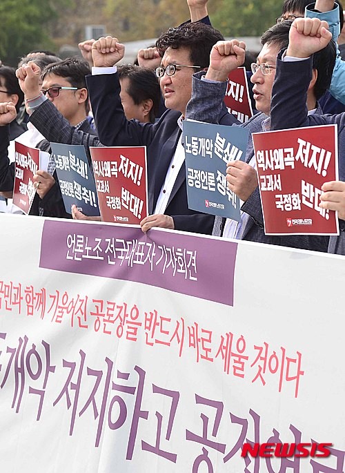 전국 49개사에 속한 4,713명으로부터 동의를 얻은 언론노조는 3일 '현업 언론인 1차 시국선언문'을 발표하며, "역사를 권력의 입맛대로 기록하려는 '한국사 교과서 국정화'에 반대한다"는 입장을 재확인했다.