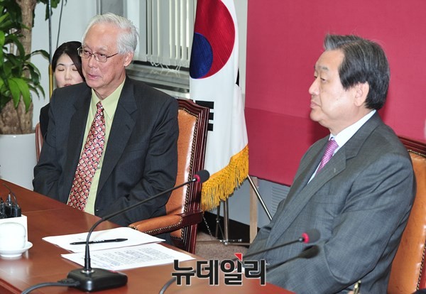 새누리당 김무성 대표가 4일 오후 서울 여의도 국회 대표최고위원실에서 고촉통 전 싱가포르 총리를 접견하고 대화를 나누고 있다.