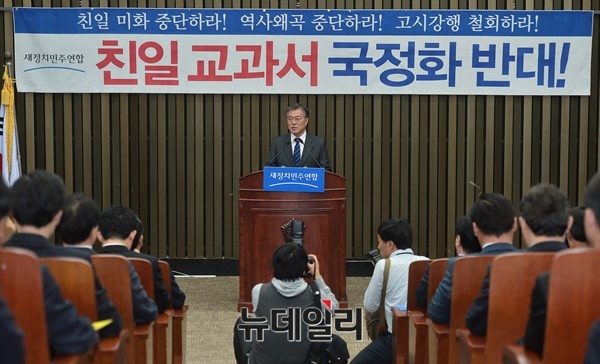 새정치민주연합이 5일 오후 국회에서 역사교과서 국정화 저지를 위한 시도당·지역위원장 연석회의를 열고, '국정교과서 중단하라', '고시강행 철회하라' 등의 피켓 등으로 국정화 저지에 나섰다.