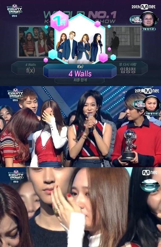 f(x)(에프엑스), 1위 후 소감은?그룹 f(x)(에프엑스)가 4인조로 재편성 후 첫 1위를 거머줬다.f(x)(에프엑스)는 5일 오후 6시 방송된 케이블채널 Mnet '엠카운트다운'에서 신곡 '4 Walls'로 임창정의 '또 다시 사랑'을 제치고 1위를 차지했다.이날 빅토리아는 "많은 분들께 감사드린다. 앨범 잘 나오도록 수고해주신 많은 분들께 감사하다는 말씀드리고 싶다"고 소감을 밝혔다. 특히 멤버 크리스탈과 루나는 기쁨의 눈물을 흘리며 말을 잇지 못했다. 데뷔 7년차 에프엑스의 뜨거운 눈물은 시청자들도 덩달아 뭉클하게 만들었다.한편 이날 '엠카운트다운'에는 f(x)(에프엑스), 트와이스, 김동완, 비투비, 엔플라잉, 오마이걸, 다이아, 업텐션, 라니아, 하이포, 몬스타엑스, 루커스, 멜로디데이, 칠학년일반 등이 출연했다.