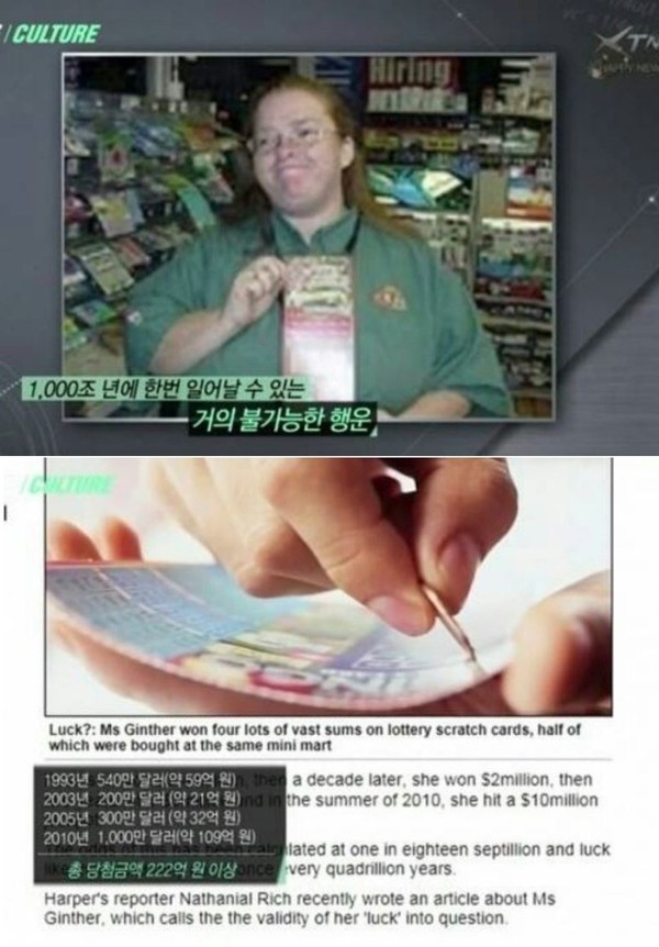 여자의 총 당첨금액은 222억원 이상으로 전문가는 1000조년에 한번 일어날 수 있는 거의 불가능한 행운이라고 말했다.
