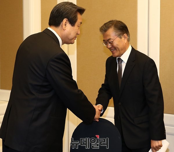 새누리당 김무성 대표와 새정치민주연합 문재인 대표가 11일 오후 서울 여의도 국회 의원식당에서 열린 선거구 획정 회동에서 악수를 나누고 있다.