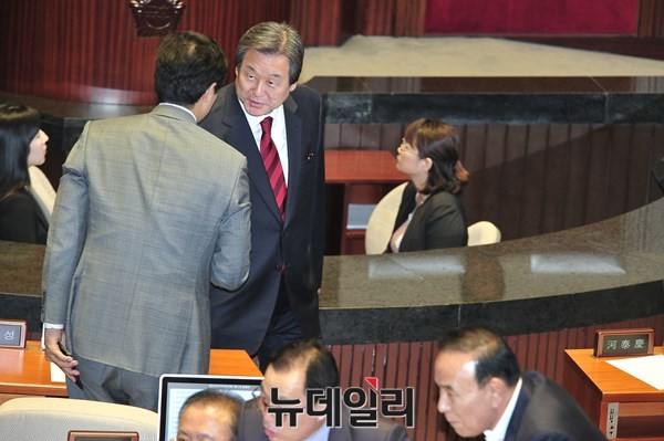 김무성 새누리당 대표가 12일 오후 서울 여의도 국회에서 열린 국회 본회의에서 동료의원과 인사를 나누고 있다.