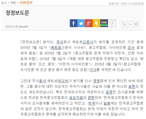 메트로는 지난 10일 자체 홈페이지에 "7월 1일부터 8월 3일까지 수차례 한국광고주협회를 비판하는 기사를 게재했으나, 이는 사실과 다를 뿐 아니라 표현의 정도도 과도했다"며 "그간 한국광고주협회의 명예를 훼손한 사실을 바로잡는다"는 정정보도문을 올렸다.