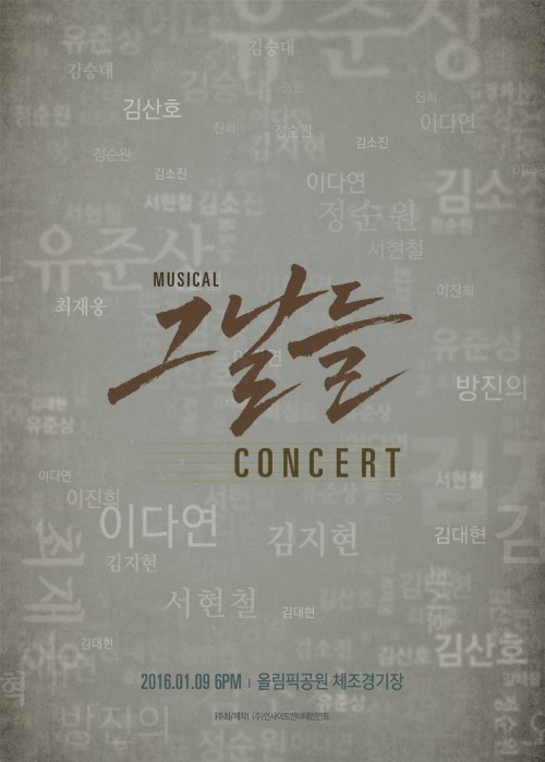 뮤지컬 '그날들' 콘서트는 2016년 1월 9일 오후 6시 올림픽공원 체조경기장에서 1회 공연된다. 티켓 오픈은 1차와 2차로 나누어 진행되며, 11월 17일 오후 2시 인터파크 티켓을 통해 1차 티켓을 오픈한다.