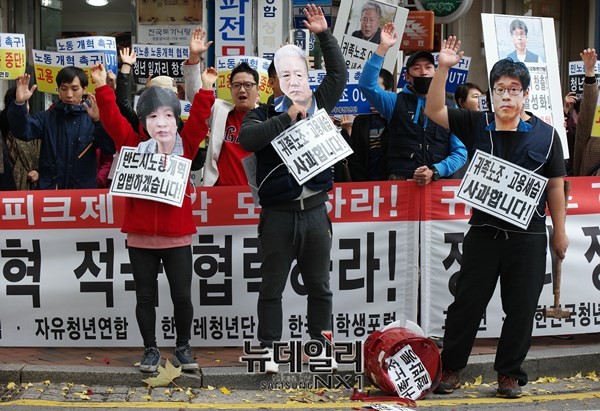 이날 모인 청년·대학생들은 한상균 민노총 위원장, 김동만 한국노총 위원장, 김영주 국회 환경노동위 위원장의 얼굴 가면을 쓰고, 민노총의 '철밥통'을 상징하는 전기밥솥을 대형 헤머로 부수는 퍼포먼스를 벌였다.