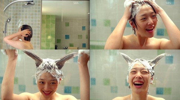 머리를 감던 도중 뾰족한 뿔 모양을 만들며 장난치는 설리의 모습이 보는 이들의 시선을 사로잡고 있다.
