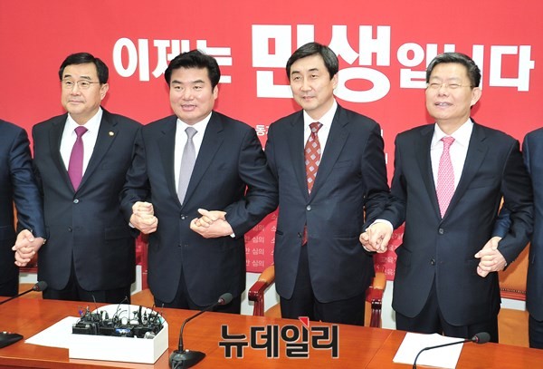 원유철 새누리당 원내대표와 이종걸 새정치민주연합 원내대표 등 여야 원내지도부가 17일 국회에서 국회 정상화 등 현안에 대해 논의에 앞서 기념사진을 촬영하고 있다.