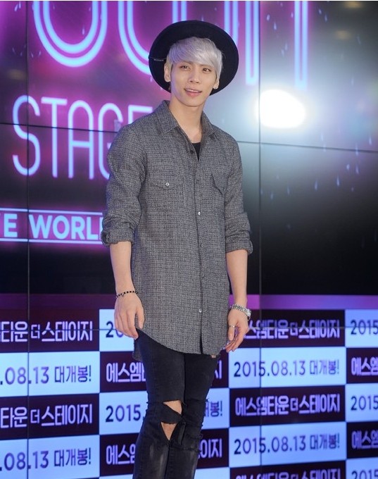 이 날 샤이니 종현은 그레이 컬러톤의 셔츠를 걸치고 블랙컬러의 디트로이트진을 입고 카메라를 향해 웃음짓고 있다.