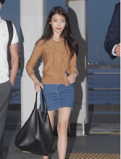 이날 아이유는 브라운톤의 카디건을 두른 듯한 디테일이 포인트인 니트 상의와 심플한 미니 청치마를 매치해 편안하면서도 발랄한 공항패션을 선보였다.