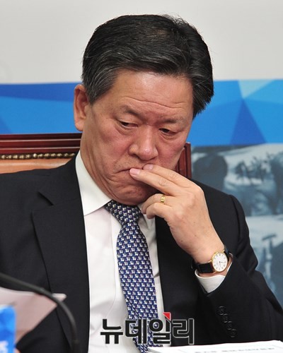 새정치민주연합 주승용 최고위원이 20일 오전 서울 여의도 국회 당대표 회의실에서 열린 최고위원회의에서 생각에 잠겨 있다. 이날 주승용 최고위원은 '문-안-박(문재인·안철수·박원순)' 임시지도부 제안을 비난하며 문재인 대표의 공개 사과를 요구했다.